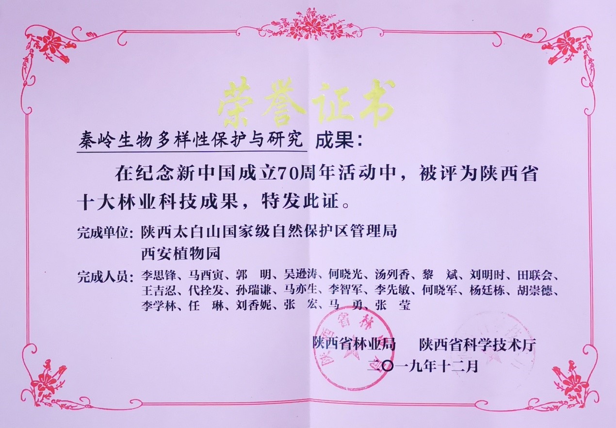 为纪念新中国成立70周年,深入贯彻习近平生态文明思想,总结梳理我省林业科技工作成效及发展思路。近日,陕西省林业局和陕西省科技厅发布《关于表彰全省十大林业科技成果的决定》,其中由我园与陕西太白山区国家级自然保护区管理局联合申报的“秦岭生物多样性?;び胙芯俊毕钅炕瘛盎袢∈罅忠悼萍汲晒?。