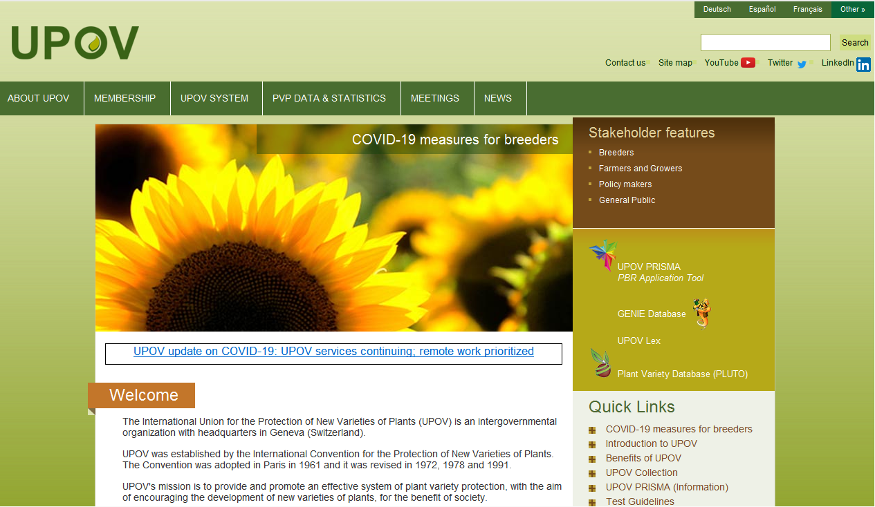 国际植物新品种?;ち?International Union For The Protection Of New Varieties Of Plants),简称 UPOV,是一个政府间的国际组织,总部设在日内瓦。UPOV是依据国际植物新品种保护公约(“UPOV公约”)建立的。UPOV公约于1961年11月由比利时、法国、联邦德国、意大利和荷兰在巴黎签署。至今有成员国76个,包括93国家。UPOV的职责主要是协调和促进成员国之间在行政和技术领域的合作,特别是在制定基本的法律和技术准则、交流信息、促进国际合作等方面发挥着重大作用。成员国根据国际植物新品种保护公约规定的原则,分别对植物新品种授予品种权。
