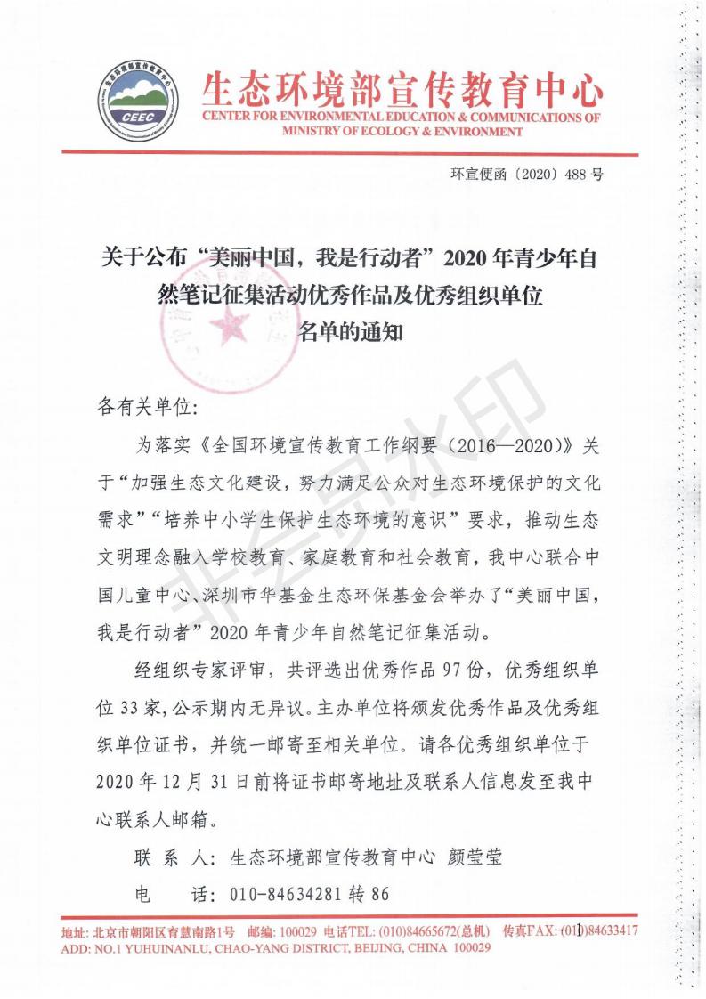 近日,从生态环境部宣传教育中心获悉,为倡导人与自然和谐共生,推动生态文明理念融入学校教育、家庭教育和社会教育,由环境保护部宣传教育中心与中国儿童中心共同举办的“美丽中国,我是行动者——2020年青少年自然笔记征集活动”结果揭晓。陕西省西安植物园被评为优秀组织单位。