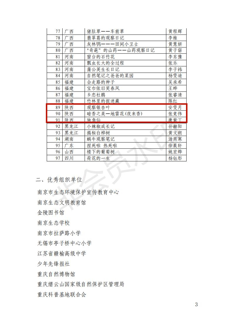 陕西省西安植物园作为本届全国青少年自然笔记征集活动的组织单位,在征集活动启动后通过微信和科普活动进行了大力宣传,并积极组织作品评选及报送工作,共报送自然笔记作品13幅,其中3幅作品在最终的全国评选中获奖。