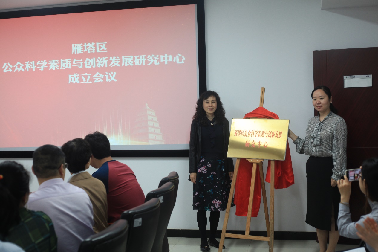 仪式上,雁塔区科工局局长薛瑛宣布成立雁塔区公众科学素质与创新发展研究中心的决定和通知,雁塔区科工局副局长白惠元宣读了研究中心的人员组成,并由西安市科协副主席王晓红及雁塔区科工局局长薛瑛为研究中心揭牌。