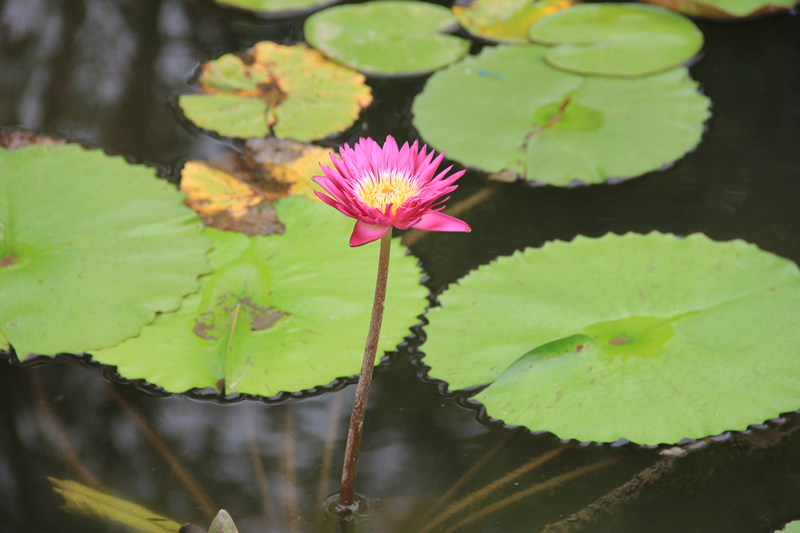 作为睡莲品种展示区,与往年的展示形式相同,依然以品种睡莲为主体,不同的则是今年共引进热带睡莲新品种13个,其中,“红色闪耀”、“泰国粉”2个古热带睡莲品种,“黄蟹爪”(有8个萼片、一般睡莲只有4个)、“公牛眼”、“艾利克斯”、“桑格巴尔之星”(2000年国际睡莲新品种竞赛冠军)等8个广热带睡莲品种,“变色澳洲”、“永恒睡莲”、“红心澳洲”3个大型澳洲睡莲品种。颜色各异的睡莲慵懒的漂浮在水面上,静谧绽放,美艳万分,好似上帝打翻的调色盘,给这片水域增添了不少花色。