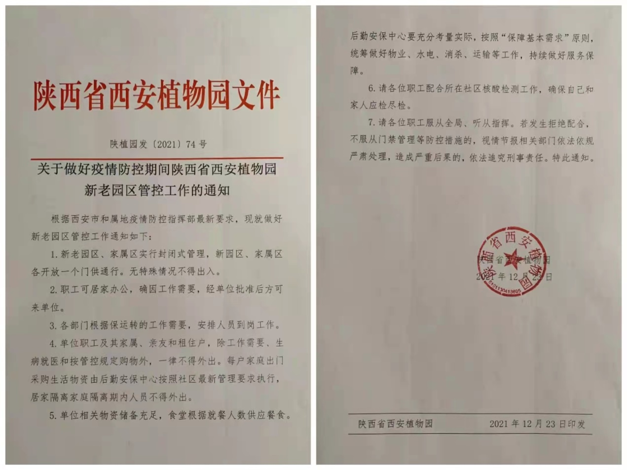 自12月9日以来,西安新冠疫情形势陡然严峻,确诊病例呈现爆发式增长,12月23日全市被迫进入封闭管控状态,防控形势复杂严峻,防疫任务十分艰巨。为响应省市区疫情防控指挥要求,认真贯彻落实陕西省科学院疫情防控决策部署,陕西省西安植物园在第一时间进行了响应和应对,全园干部职工快速动员、冷静应对、上下联动、真抓落实,把疫情防控各项工作落到实处,全力保障职工群众生命安全和单位稳定有序运转。