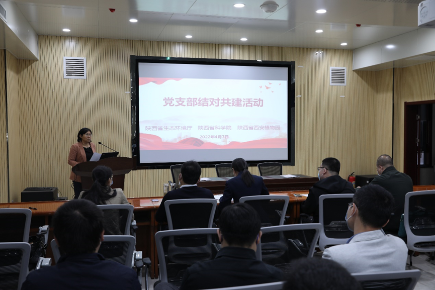 会议首先由杨文正介绍党支部结对共建活动背景,并介绍分省院基本情况及党建工作概况,陕西省生态环境厅自然生态保护处党支部书记、处长孟卫萍,陕西省西安植物园党委书记、副主任陈立也分别对本单位基本情况、业务领域与党建工作等进行简介。随后,三位同志代表各自所在党支部签署了 “1+1+1” 党支部结对共建协议。