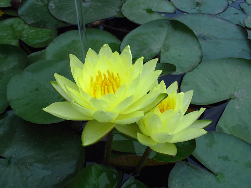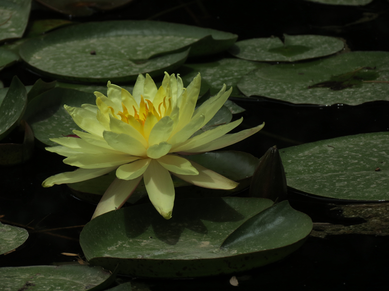 1.睡莲品种‘日出’(Nymphaea ‘Sulphurea Grandiflora’异名N. ‘Sunrise’), 由法国睡莲育种家Joseph B. L. Marliac于1905年杂交育成,亲本不详。1998年以地下茎形式引自中科院北京植物园。该品种为白天开花型耐寒睡莲品种,丰花、花期长、抗逆性强。叶展幅120~150 cm;叶正面绿色,背面黄绿色,叶背散生紫红色小斑块,叶片直径20~28 cm;花星状,淡黄色至亮黄色,花瓣数量23~28,花径14~20 cm,浮水或挺水开放;花期4~10月。(选育人:余刚等)