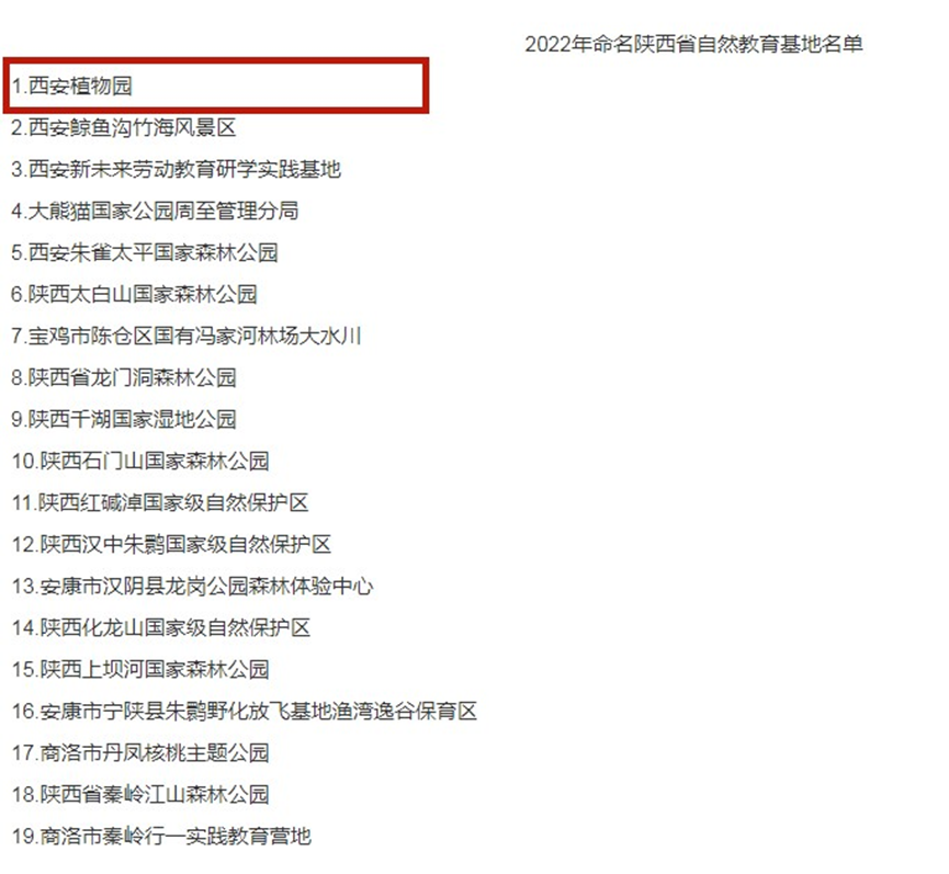 近日,陕西省林业局、共青团陕西省委经过自下而上推荐和相关专家实地核查,遴选并公布了19家陕西省自然教育基地名单,其中西安植物园榜上有名。
