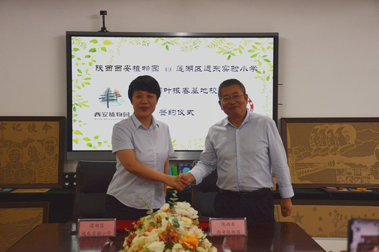 接下来,学生代表进行了发言,表示经过刨土、浇水、撒种、培土到陕西羽叶报春在校园绽放,他们深刻体会到了科研工作者挽救濒危植物的不易,会更加珍惜赖以生存的大自然。随后,西安植物园主任岳明与莲湖区远东实验小学校长行璐签署合作协议并授牌。