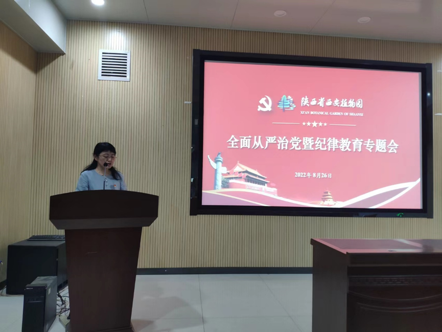 围绕纪律教育学习主题,园党委理论学习中心组于8月26日召开了一次全面从严治党暨纪律教育专题会。园党委书记陈立主持会议,特别邀请岳明主任参加会议并发言,园领导班子、党委委员、纪委委员、园务委员、中层以上领导干部、支部书记和支部委员参加了此次集中学习?;嵋檠傲恕兜澄?党组)落实全面从严治党主题责任规定》、中共中央办公厅印发《关于进一步激励广大干部新时代新担当新作为的意见》、《中国共产党纪律处分条例》及警示案例简报,并汇报了2022年上半年全面从严治党工作情况及下半年工作安排。