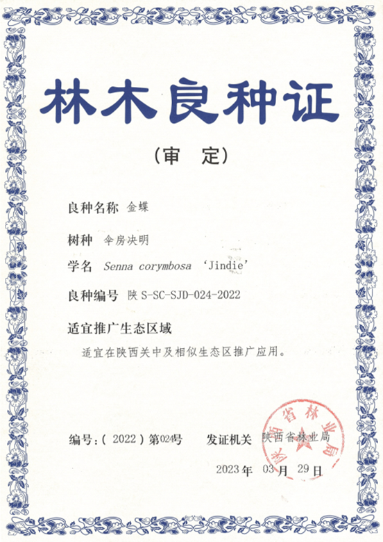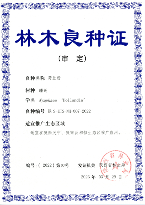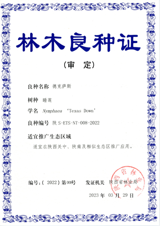 近日,由我园特色观赏植物引种驯化选育及应用研究团队实生选育的‘金蝶’伞房决明、‘金露’双荚决明2个决明属品种以及水生植物与湿地修复研究团队引种驯化的‘日出’、‘荷兰粉’、‘芭芭拉’、‘德克萨斯’4个睡莲品种通过2022年度陕西省林木及草品种审定委员会审定,获得林木良种证书。