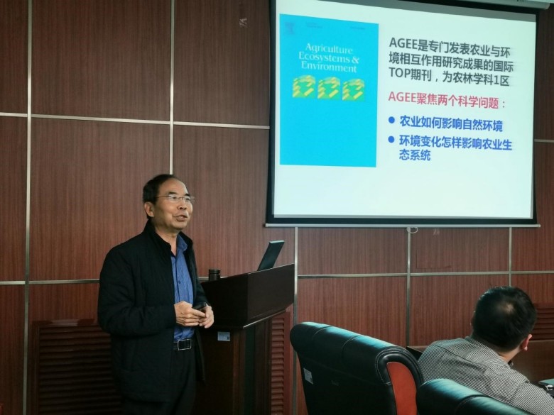 2023年5月4日上午,《Agriculture Ecosystem & Environment》主编、广西大学李勇研究员来园交流并作题为《农业与环境相互作用关注热点/AGEE投稿问题》的学术报告。报告在翠华园区一楼会议室举行,30余名科研人员参加会议,岳明主任主持会议。