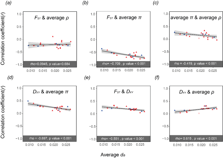 图3 物种对间不同参数之间的相关性沿着分化梯度的变化趋势