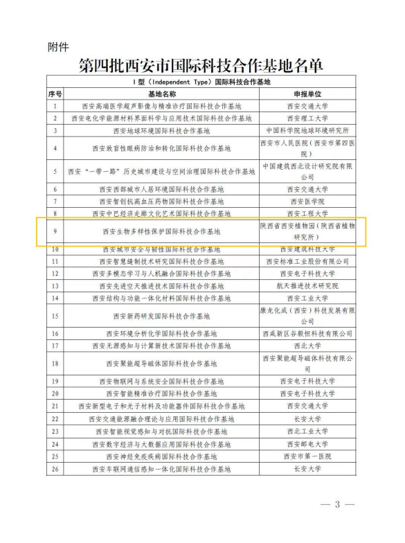 近日,根据《西安市国际科技合作基地认定管理办法》(市科发〔2023〕8 号)的有关规定,市科技局开展了第四批西安市国际科技合作基地的申报、认定工作。经过评审、考察和公示等环节,40家单位被认定为第四批西安市国际科技合作基地。陕西省西安植物园(陕西省植物研究所)推荐的西安生物多样性?;す士萍己献骰鼗衽隙?。