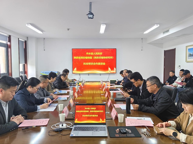 4月1日,商洛市柞水县副县长付艳艳、乡村振兴局局长龙少峰、乾佑街道办事处主任赵鹏、科技局副局长王维智及马房子村支部书记汪绍华及村民代表等一行22人到访我园并召开科技帮扶与合作座谈会。陕西省西安植物园(陕西省植物研究所)园主任岳明、副主任刘立成、纪委书记韩桂军、总园艺师李艳、园务委员兼马房子村帮扶干部高书宝及科普宣教中心、科研中心负责人等参加座谈。