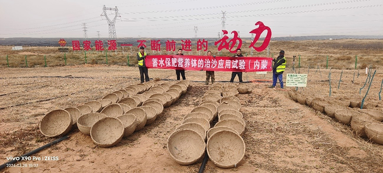 蓄水保肥型营养钵是以农林废弃物为基底物料,通过对蓄水基质、营养菌肥、黄原胶等进行有效配比,经自行设计的机械压制而成凹形钵体。该钵体既能为沙生植物蓄存生长所需水分,也可为植物生长和根系分蘖提供缓释型养分。前期试验表明,该蓄水保肥型营养钵可提高灌木白刺(Nitraria tangutorum Bobrov)幼苗成活率30%,并节约50%灌溉水。目前,我园研究团队在内蒙古鄂尔多斯地区持续开展沙地植被生态修复研究,充分挖掘原生灌木和草本植物20种,本次增加新技术成果的应用,旨在应用地上地下共同发力的方式,开展综合立体化的沙地植被修复工作。