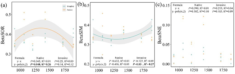 根际土壤细菌β多样性与海拔梯度之间的关系。(a) 群落总不相似性; (b) 群落总不相似性的更替组分; (c) 群落总不相似性的嵌套组分