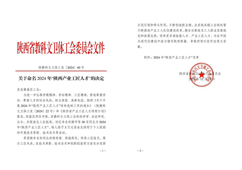 近日,为进一步弘扬劳模精神、劳动精神、工匠精神,营造尊重劳动、尊重人才的社会风尚,树立典型、表彰先进,陕西省教科文卫体工会委员会发布《关于命名 2024 年“陕西产业工匠人才”的决定》(陕教科文卫体工发〔2024〕40 号),我园副研究员、高级实验师张莹同志荣获2024年“陕西产业工匠人才”称号。