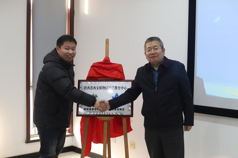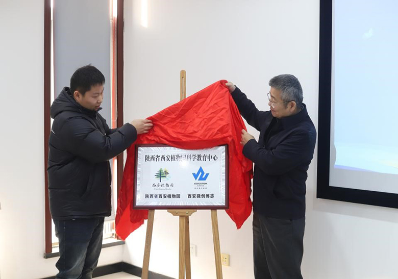 陕西省西安植物园主任岳明、北京微创博志教育科技有限公司西安分公司主任杨广安共同为植物园“科学教育中心”揭牌。