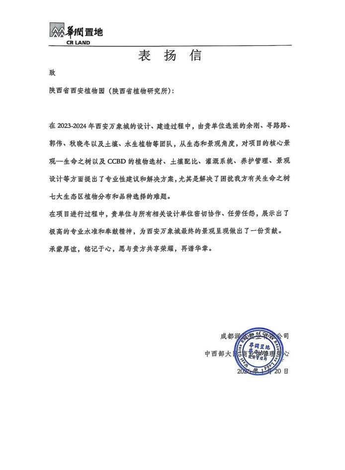 此次参与CCBD项目“生命之树”的建设,对于陕西省西安植物园是一次难得的机会,也是一次专业能力的检验。不久前,收到来自华润置地的表扬信,信的字里行间表达着对陕西省西安植物园参与“生命之树”建设工作的肯定,也是对植物园在植物科学研究与应用领域所取得成就的认可,更是对植物园今后发展的鞭策。未来,陕西省西安植物园将继续秉持初心,深耕植物?;び肷芯苛煊?,积极发挥自身优势,参与城市绿化和生态建设,为西安的绿色发展贡献更多智慧和力量。