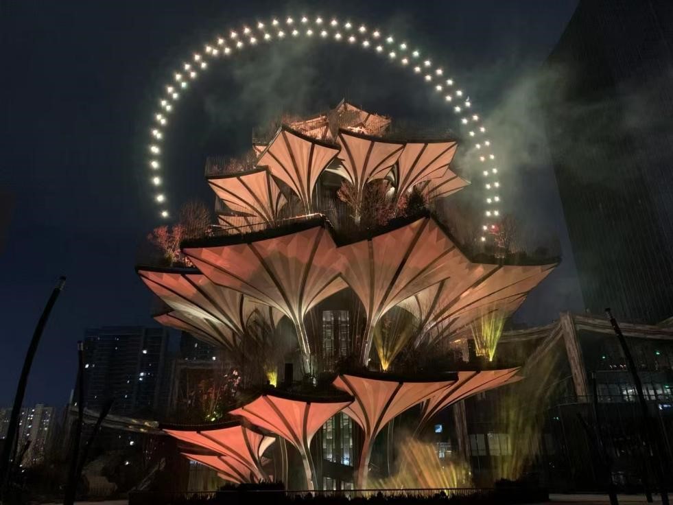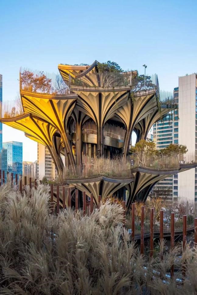 “生命之树”作为古城西安新地标与城市名片,自2024年12月9日正式亮相以来,便吸引了无数市民和游客的目光。这座以西安古观音禅寺千年银杏树为灵感的建筑,高达57米,由60片巨型叶片构成?!吧鳌本肮凵杓埔运砍裰肺楦?,选取丝路沿线 7 个植物生态代表性区域,从秦岭、西北干旱地区开始,翻越帕米尔高原、中亚直至欧洲地中海沿岸,这些具有典型地域特征的景观逐一展开,巧妙化解了在有限空间内展现丝绸之路浩瀚广袤、复杂多变的不同生类型生态景观难题,同时还给建筑景观赋予了深厚的历史文化内涵。这一创新设计在展示壮阔多元的丝绸之路景观的同时,也在景观设计领域开拓了一个全新的创作理念和视角,也将成为国内建筑和园林行业的一个设计典范。