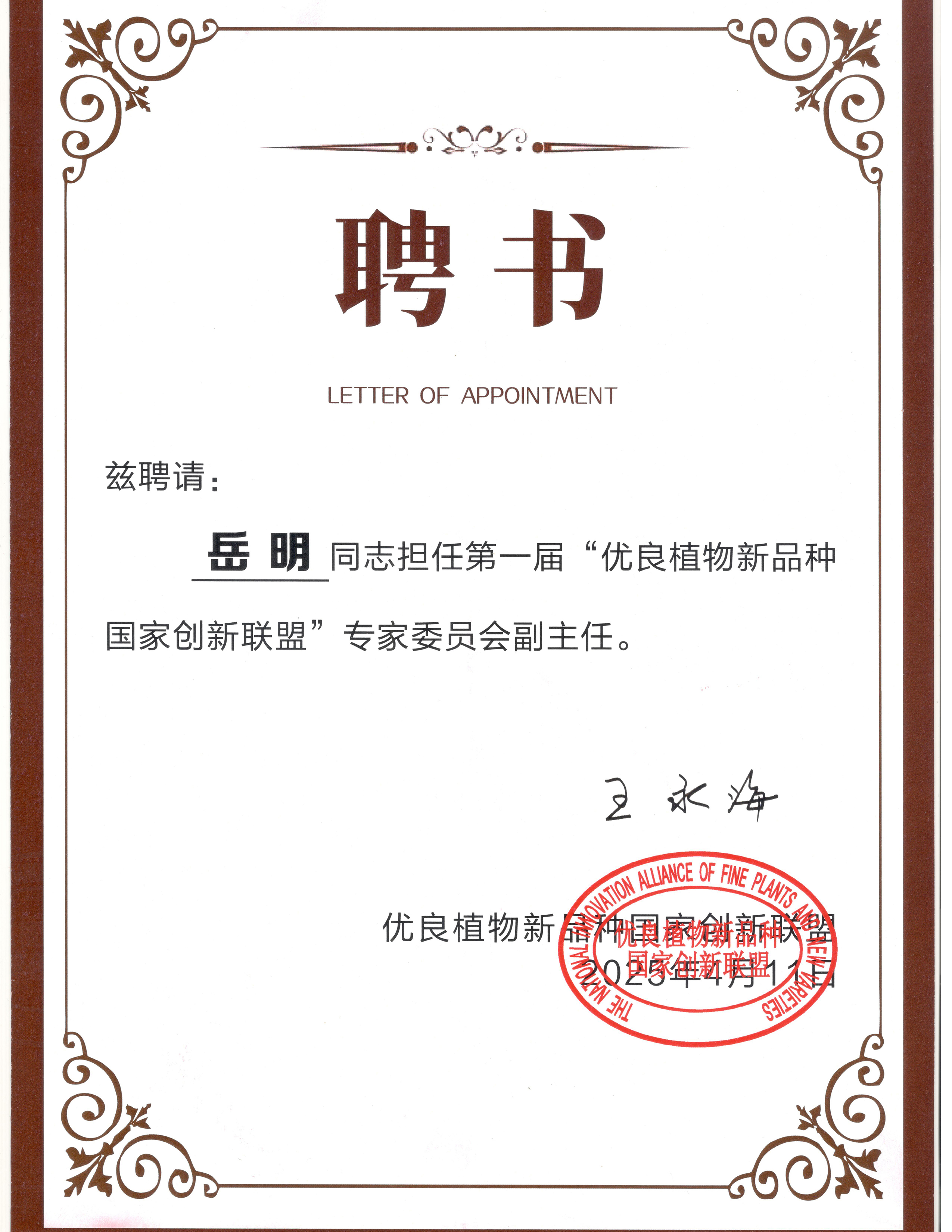 2025年4月10日,由优良植物新品种国家创新联盟主办的“林草领域新质生产力培育及优良新品种转化应用发展峰会暨优良植物新品种国家创新联盟2025年度会议”在云南省昆明市召开。陕西省西安植物园当选优良植物新品种国家创新联盟副理事长单位,我园主任岳明教授聘为第一届“优良植物新品种国家创新联盟”专家委员会副主任。