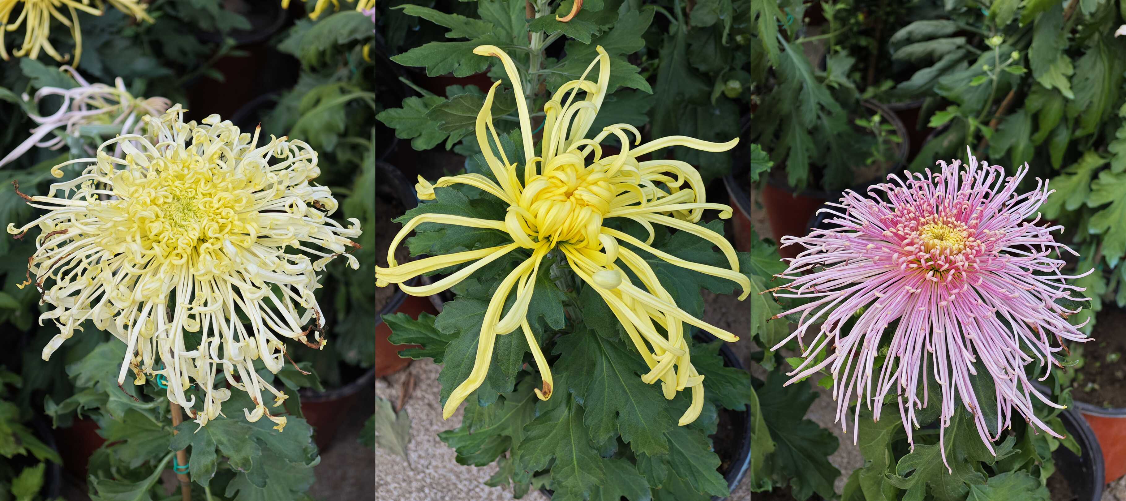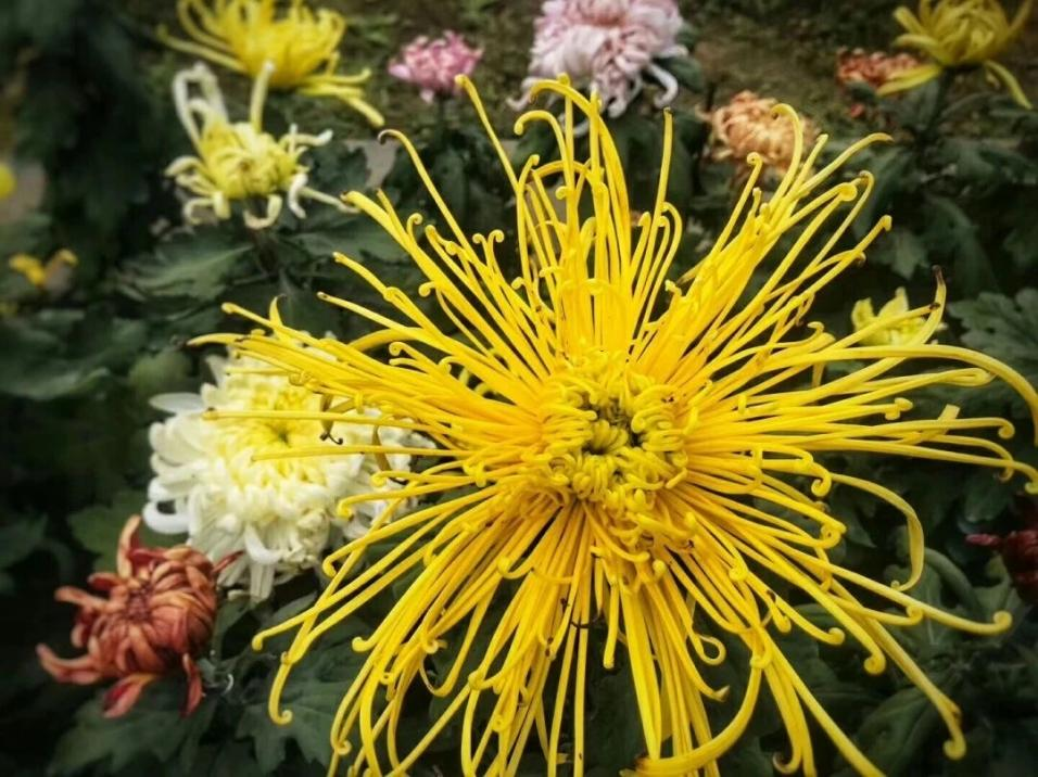 本届花展设立3大展区,分别位于西大门、本草园、水景园,展示各类北京小菊、多头菊、独本菊等各类型菊150余个品种,其中有绚秋、寒露、傲霜等三个系列,32个花色的北京小菊;金背大红、国花强大,天下一品等20余种独本菊品种;有妃子浴、粉龙爪、玉蝶、傲寒、美红等105个多头菊品种,以及盆景菊、大立菊、悬崖菊、塔菊等多种艺菊造型,结合各类菊科花卉和其他应季花卉,总花量约为10万余盆。菊花作为秋季最具代表性的花卉之一,在展区中汇聚了单瓣、重瓣及桂瓣等多个花型的菊花,这些菊花涵盖了红、粉、紫、黄、白等多个颜色。今年花展以各色菊花沿主路铺展,形成绵延数十米的菊花长廊,搭配造型各异的菊球、菊柱,达成以点成线的游览路线。尤其是在本草园,采用斑块式混搭的种植方式,将各色菊花与香彩雀、彩叶草、超级风仙等数十种草本花卉交织在一起,根据其花期、高低、色系搭配种植,使不同花期的植物陆续开放,给游客带来不同时段欣赏不同美景的美好体验。同时,还利用场地空间特点打造出不同风格的花镜,根据现有生境条件选择适宜的品种,最终打造出多种风格融合共生的区域,使整个展区在秋季显得格外丰富且具有层次感。漫步其中,空气中弥漫着淡淡的菊香,让人心旷神怡。