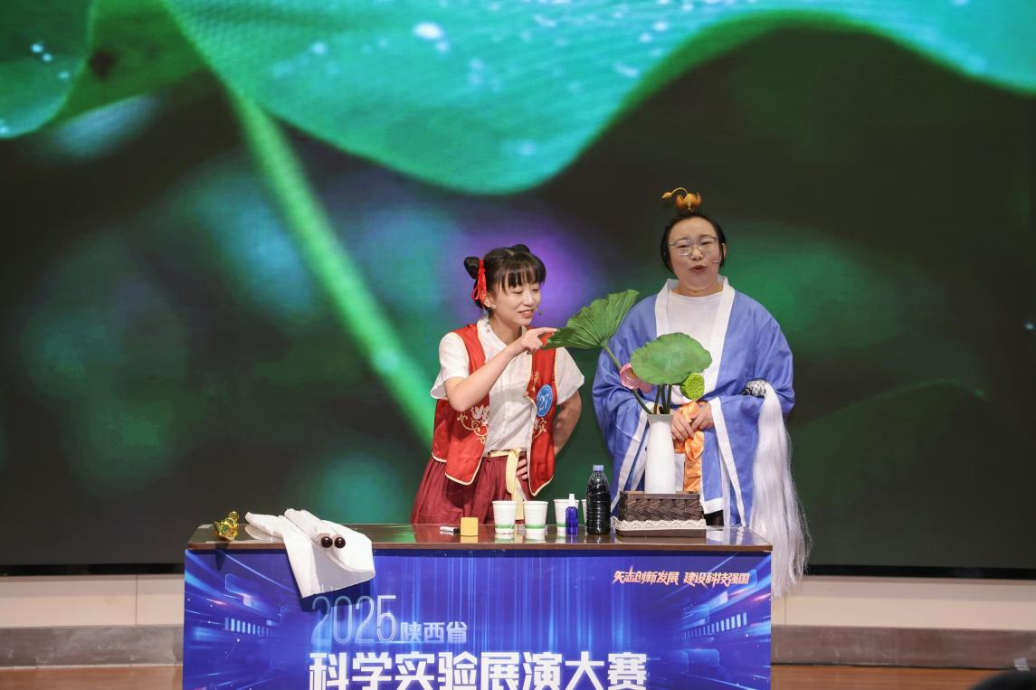 陕西省西安植物园的丁芳兵、王雅婧共同呈现了题为《仙莲探秘:荷叶的超疏水现象》的实验展演荣获二等奖。该展演巧妙地将神话剧情与科学实验相结合,用沉浸式的表演讲述了荷叶的特殊构造,通过有趣的实验向我们生动诠释科学家如何在纳米级尺度进行超疏水材料等的研究。她们以活泼生动的表演形式,将复杂的科学知识转化为感染力十足的科学剧场,深刻展现了科学与创新融合,极具思想性与观赏性。