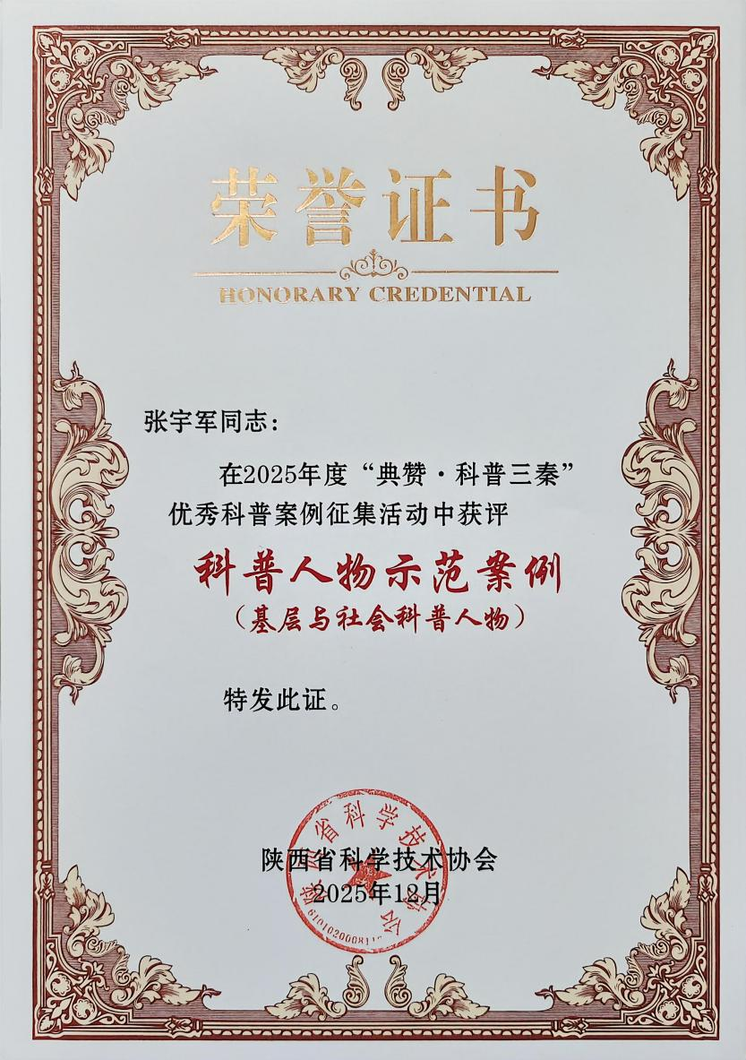 多年来,张宇军的科普足迹遍布校园与社会各界。被2所学校聘任为科学副校长,同时担任多所学校的科技辅导员和指导专家顾问,将科普教育融入日常教学;作为陕西秦岭发展研究会理事、雁塔区公众科学素质与创新发展研究中心委员、首批陕西省自然教育特聘讲师,首批陕西省科普高级职称获得者,积极参与各类科普规划与实践,多次被省科技厅、省科学院、省科协等授予科普荣誉证书。