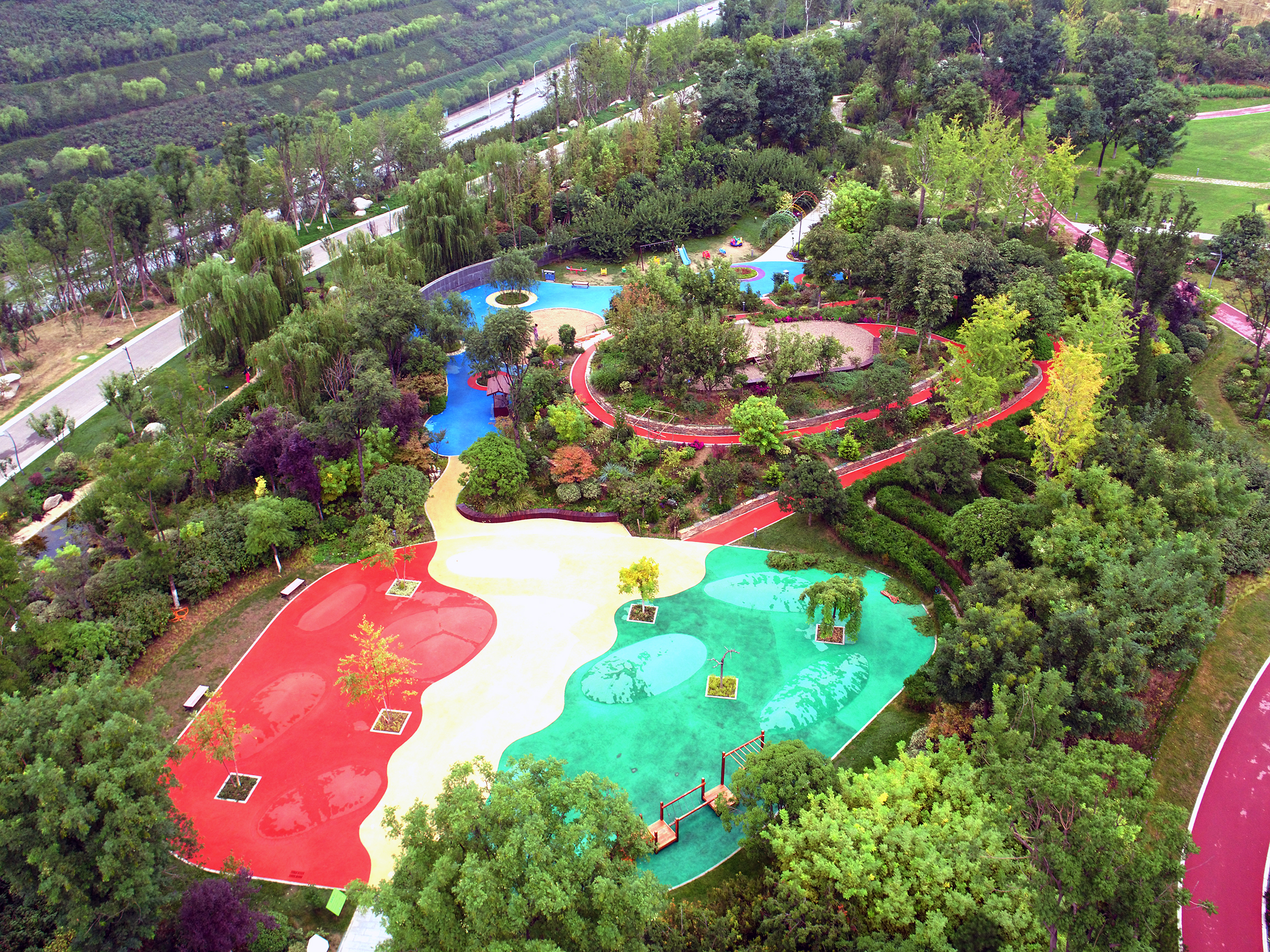 儿童园由视觉园、触觉园和嗅觉园三个区域以及植物造型、涂鸦墙、科普柱、平衡器械、沙坑等设施构成,分别配置彩叶、叶质多样、芳香等奇特植物,使儿童在游玩中感知和认识奇妙的自然世界。