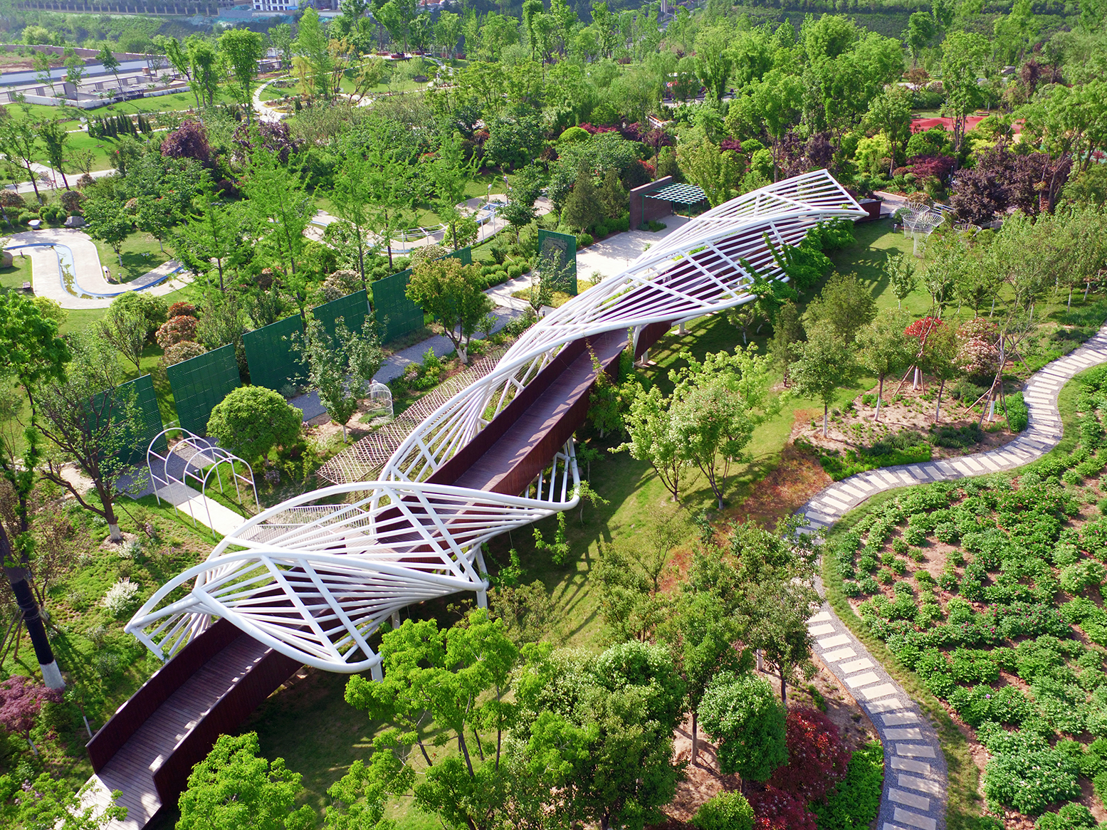 藤蔓园分为紫藤主展区、缠绕区、吸附区、卷须区、蔓生区五个分区。紫藤主展区:引种中国、欧洲、日本品系中的多花紫藤品种;缠绕植物区:以螺旋状缠绕他物向上生长的植物为主,如木通、金银花等;吸附植物区:依靠吸盘和气生根附着或穿透物体表面而攀援的植物,如地锦、凌霄、常春藤等;卷须植物区:依靠特化的攀援器官卷须进行攀附延展的植物,如葡萄、铁线莲等;蔓生植物区:通过栽培措施发挥其茎蔓生习性的植物,如藤本月季等。