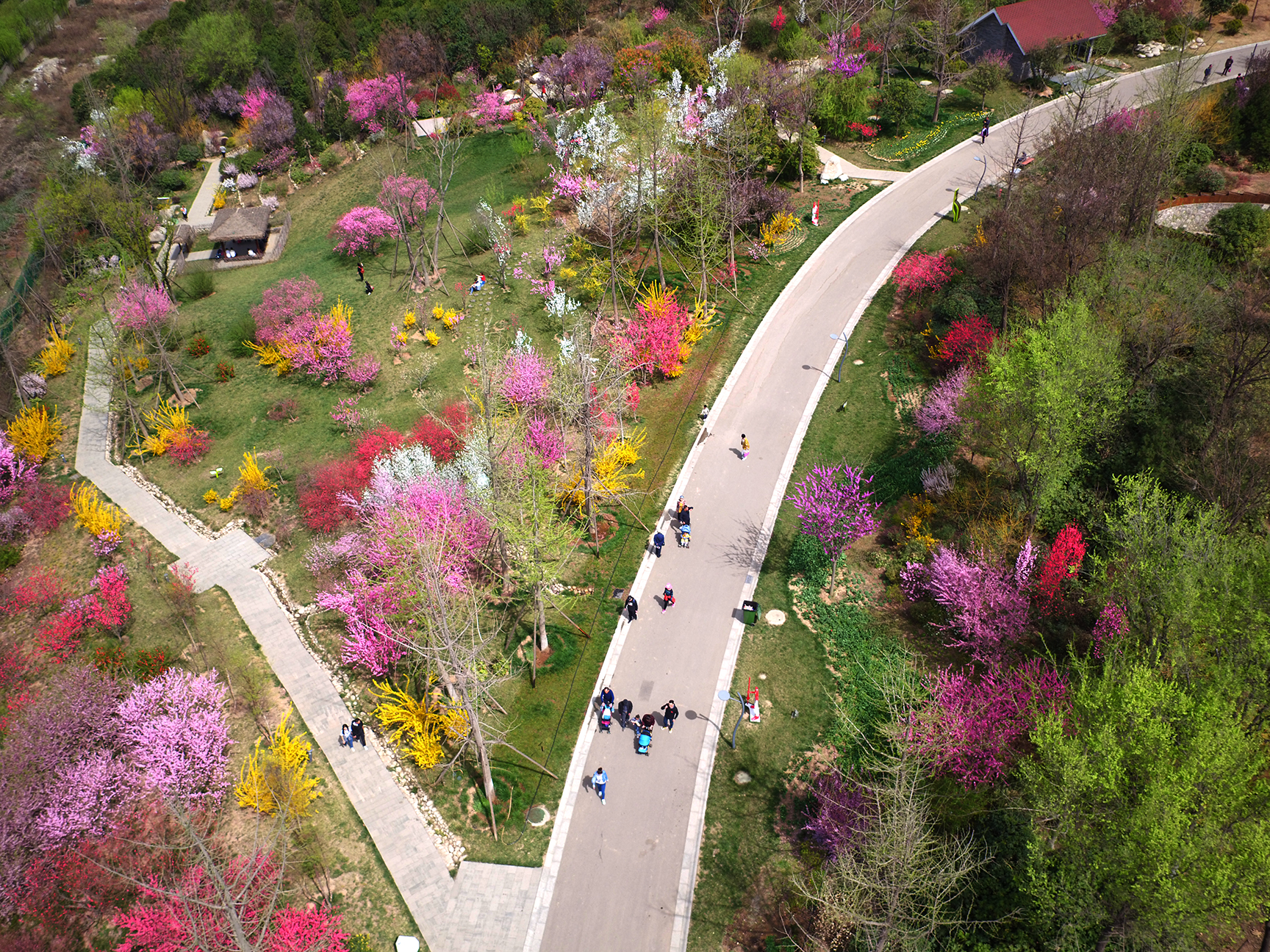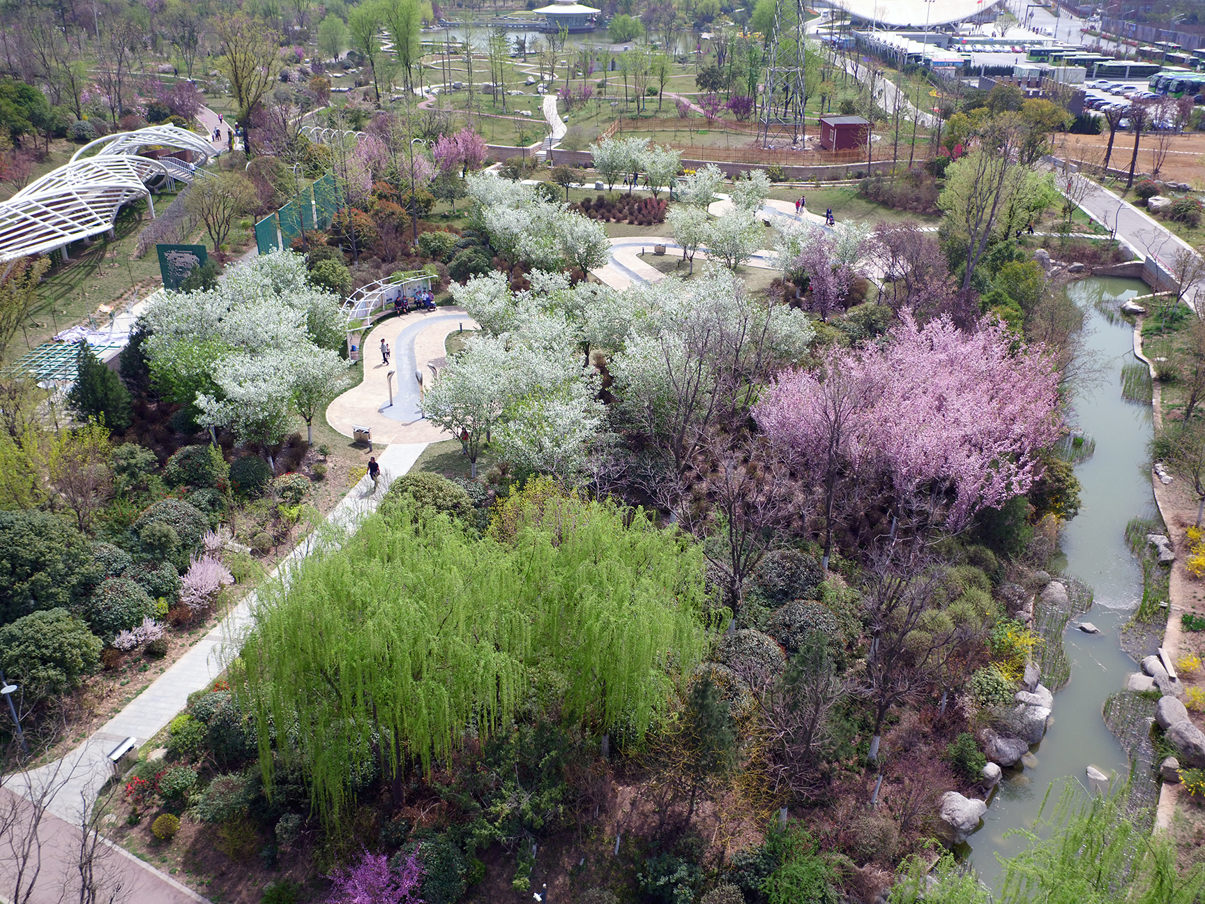收集展示40多个?;ㄖ趾推分?,盛开时积云堆霞,终花时落英缤纷。园区色白如雪的“染井吉野”形成如梦如幻的“花吹雪”,飘逸的“垂枝?!庇倘绶凵俨迹涫甭煊S昶?,与园区的水系形成富有诗意的花溪景观。中国?;ǖ募锹伎勺匪莸侥纤问逼?“初樱动时艳,擅藻灼辉芳,缃叶未开芷,红葩已发光”。